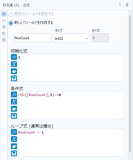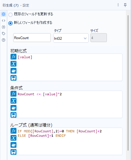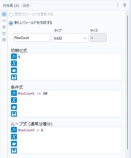 行生成ツールの条件式の部分は、条件が満たす間実行する、という動きを行い、デフォルトだと以下のスクリーンショットの通り10以下ならループ式を実行する、という形になり、1~10が生成されます。