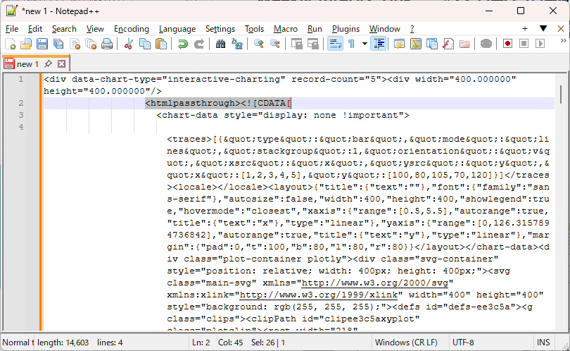 インタラクティブチャートは、Plotlyというライブラリを用いてチャートを作るため、非常に複雑なHTMLで構成されます。このような複雑なものを表示したい場合はhtmlpassthroughとCDATAタグでレポートスニペットに埋め込まれます。