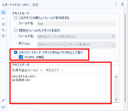 レポートテキストツールのエキスパートモードを使ってみましょう。以下のようにテキストモードを「エキスパートモード」にすればオッケーです。