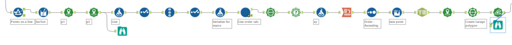 今回は上の計算で求められたポイントの組み合わせでラインを作り、隣接するラインを求めるマクロを作りました。これで、ラインの順番が並び替えられます。しかしながら、ラインの中身(始点と終点)の順番は作ったときのものがそのまま採用されるので、このままだとポイントにしたときに並びません(大きい一つのポリゴンにするために、ポイントに分割して、並び順を指定する必要があります)。