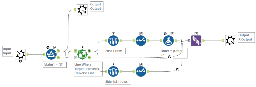 結構な力技ですが、以下のように隣接するラインを上から順に並べ、x(項目名は0)とy(項目名は1)が前の行と異なるように、始点もしくは終点を選択するような数式を複数行フォーミュラで組み立てました。