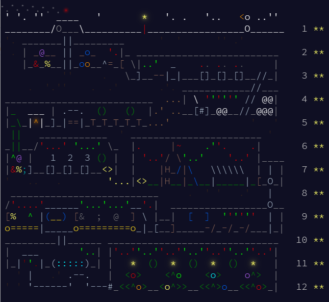 一番したの部分が、プレゼントを保管する場所です。例えば、「4×4: 0 0 0 0 2 0」であれば、縦が4、横が4、荷物の形状が4の荷物を2つ、という意味になります。つまり、以下のような4×4のスペースを考えると・・・。