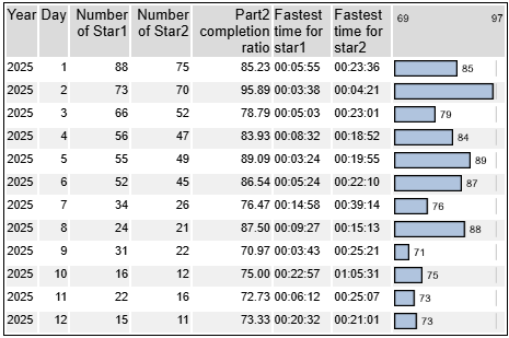 今年の一番難易度が高いのはやはりDay10なのはもう見てわかりますね。最速クリアが圧倒的に時間がかかっている唯一のものです。そして、Day10は最適化ツールがほぼ必須です。これなしの回答にたどり着いた人はほとんどいませんが、難易度から考えると妥当でしょうか・・・。