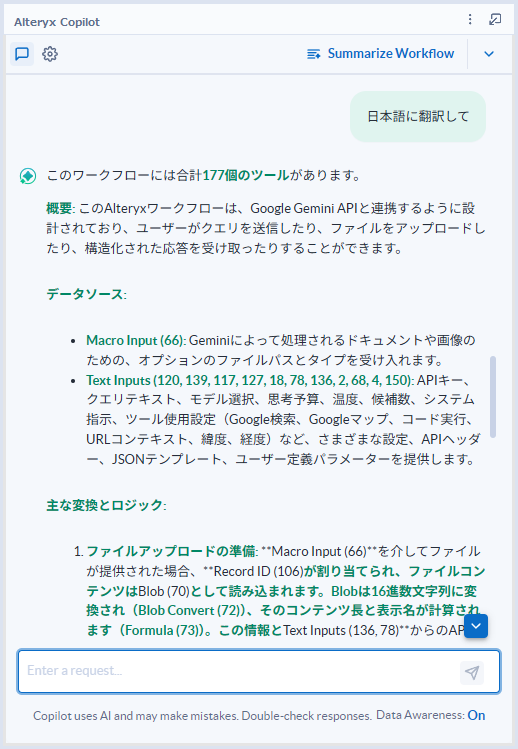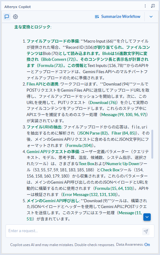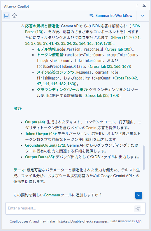 GeminiなどのLLMにざっくりワークフローを要約して、といったような聞き方ももちろん可能ですが、精度的にはAlteryx Copilotに劣ります。それなりのドキュメントにしたければ、指示プロンプトをかなり工夫する必要があるように思います。