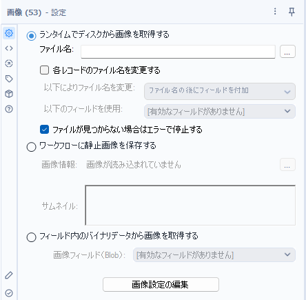 また、「ワークフローに静止画像を保存する」は、1ファイルしか読み込めません。いくつかのファイルを一括で扱いたい時は、「ランタイムでディスクから画像を取得する」もしくは「フィールド内のバイナリデータから画像を取得する」を使う必要があります。