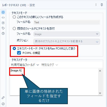 実は画像ツールでレポートスニペットとして画像を読み込むと、レポートテキストツール内で扱うことができます。ただし、みんなだいすき「エキスパートモード」を使う必要があります。