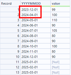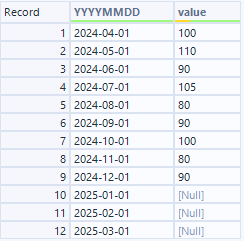 - When Datetime/Date data is converted to text, missing periods are filled in (according to the data order). For Datetime/Date data types, missing periods are displayed as null.